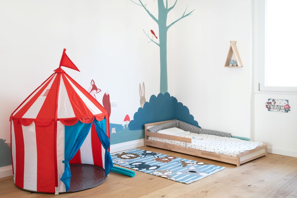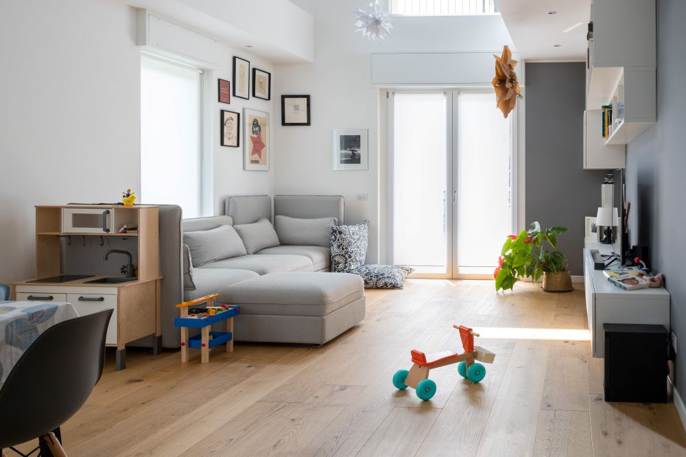 Il linguaggio degli interni segue fedelmente i principi dello stile nordico: palette neutra, geometrie essenziali, grande attenzione alla funzionalità e all’uso di materiali naturali, come il legno chiaro che caratterizza pavimenti, arredi su misura e dettagli di finitura. La cucina, aperta sul soggiorno, è pensata come luogo di convivialità quotidiana, mentre le camere al piano superiore offrono privacy, ordine e comfort visivo.