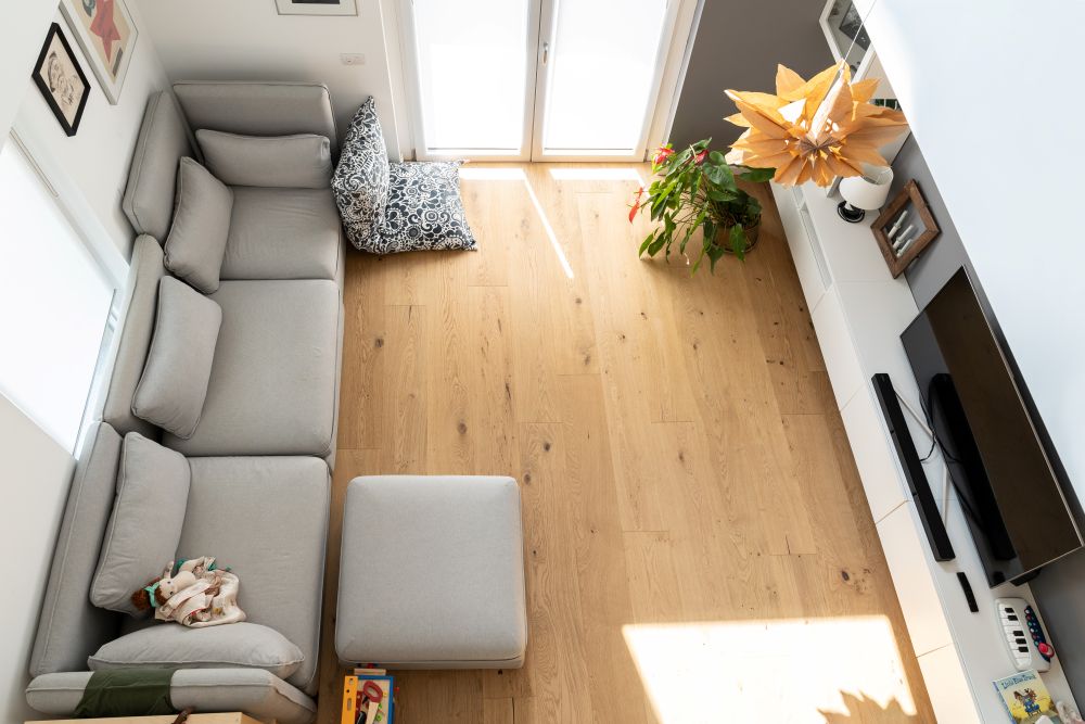 Il cuore della casa è rappresentato da un grande spazio living a doppia altezza, che collega visivamente il piano terra con il primo piano attraverso un elegante ballatoio in legno chiaro e metallo verniciato. La luce naturale, proveniente da ampie aperture su più lati, attraversa l’intero volume, valorizzando materiali, texture e colori.